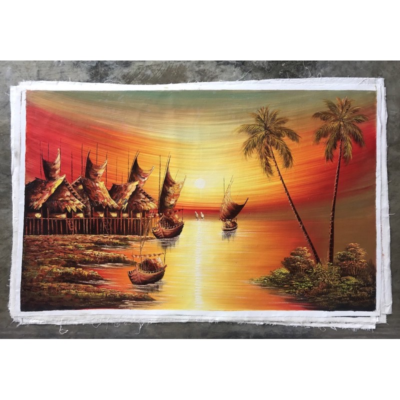 Lukisan pemandangan di tepi pantai pada waktu senja. Beli lukisan pemandangan kampung nelayan pasar mini. Gambar lukisan alam yang ada disini ada beragam jenisnya seperti lukisan pemandangan gunung . Objek kampung nelayan dilukiskan pada saat pagi hari, dalam lukisan tidak .